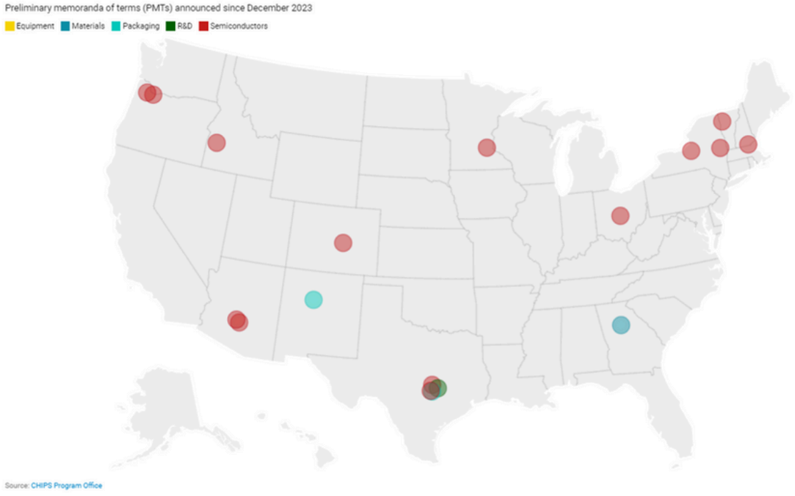 April 2024 – Micron Technology, Inc. (MU) received a $6.14 billion investment for two projects in Boise, ID, and Clay, NY. The Idaho project will focus on developing a high-volume manufacturing fab producing leading-edge DRAM chips. The fab will be co-located with the company’s existing R&D facility to increase efficiencies and synergies. The award will also help build two of four fabs in New York that will focus on manufacturing leading-edge DRAM chips. The two projects will help create over 11,000 manufacturing jobs and 9,000 construction jobs.5
