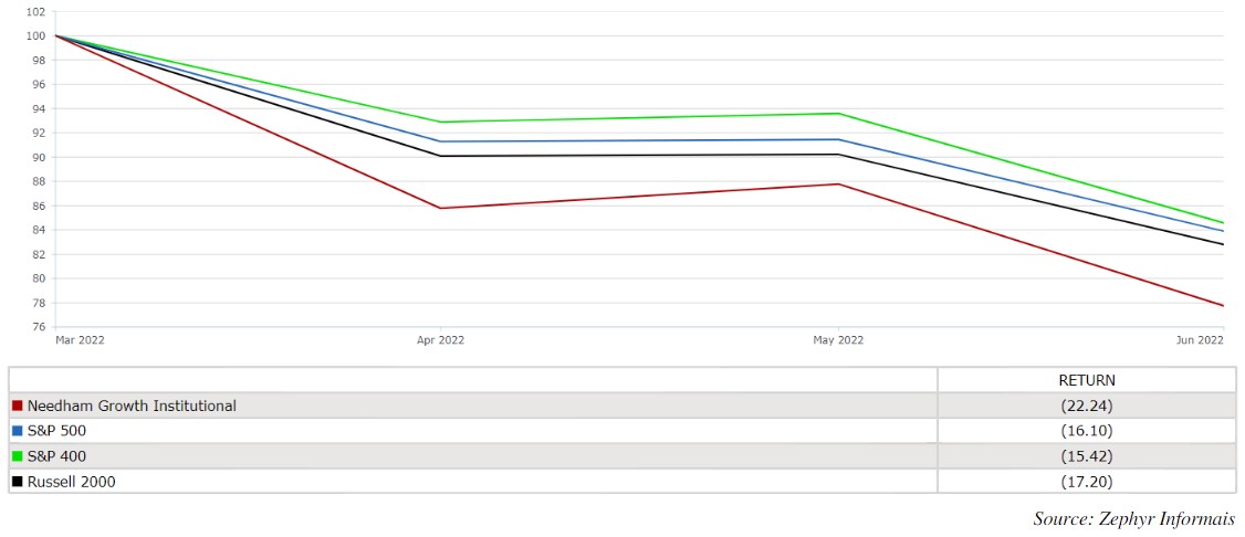 - The Fund’s Institutional (NEEIX) and Retail (NEEGX) classes returned -22.24% and -22.34%, respectively, in 2Q22, underperforming the S&P 500 Index.