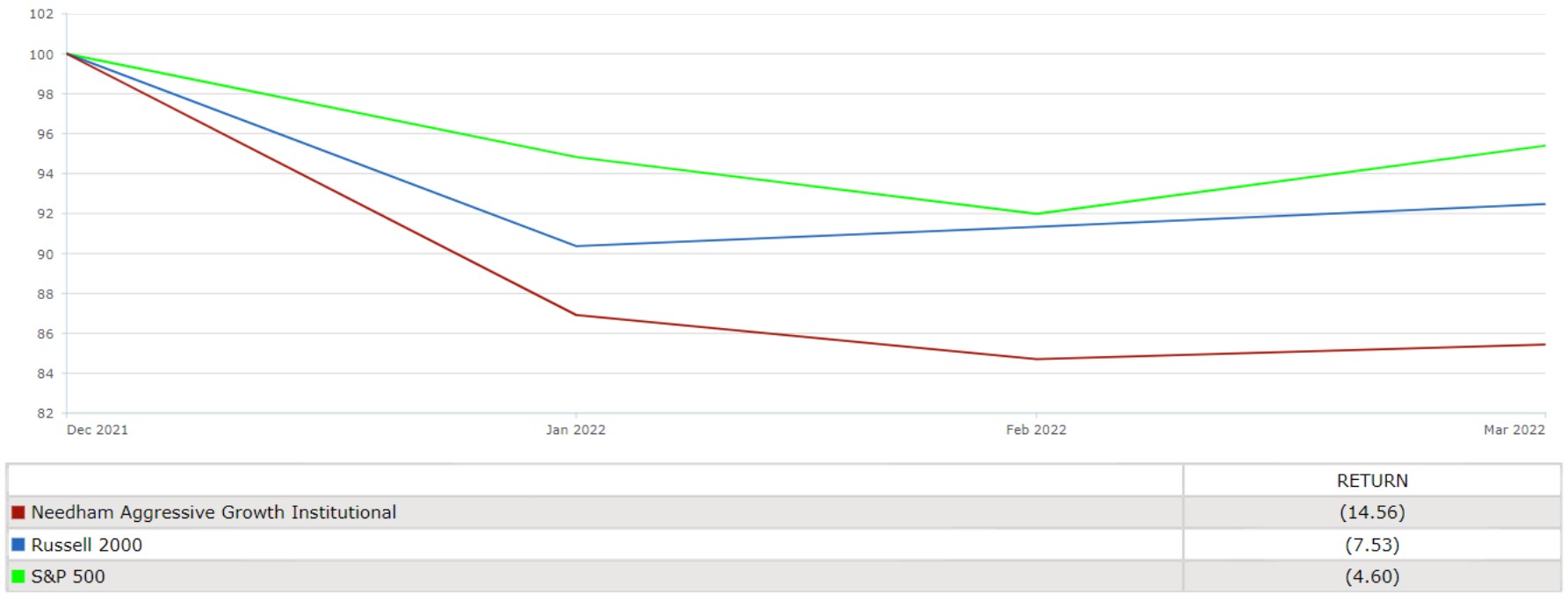 - The Fund’s Institutional (NEAIX) and Retail classes (NEAGX) returned -14.56% and -14.74% respectively in 1Q22, underperforming the Russell 2000’s -7.53%.