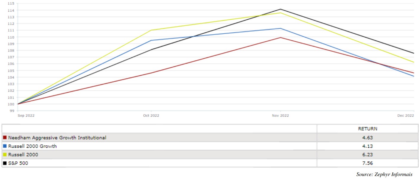 - The Fund’s Institutional (NEAIX) and Retail (NEAGX) classes returned 4.63% and 4.44%, respectively, in 4Q22, outperforming the Russell 2000 Growth’s 4.13% return.