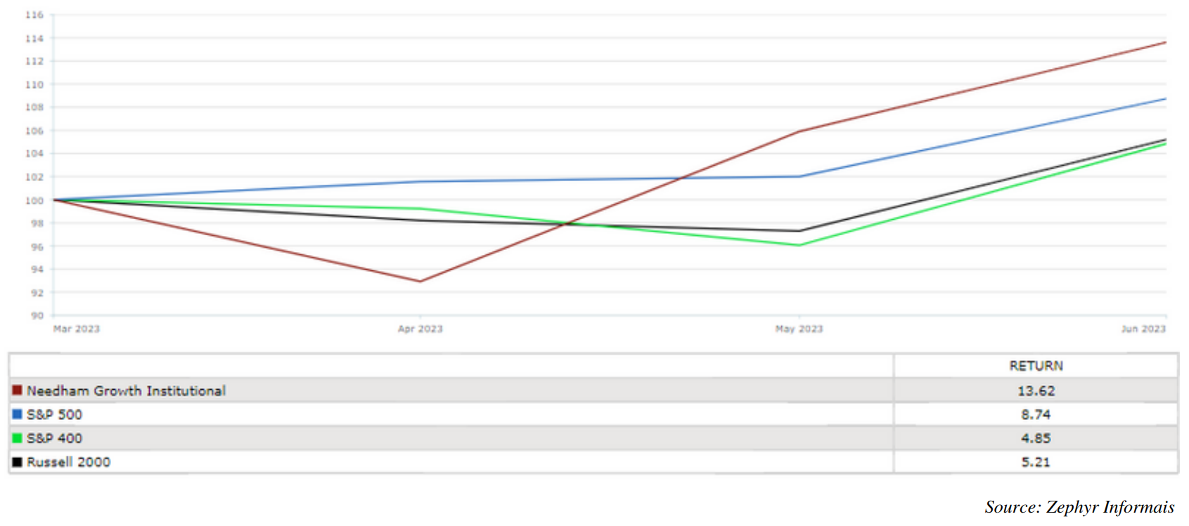 - The Fund’s Institutional (NEEIX) and Retail (NEEGX) classes returned 13.62% and 13.49%, respectively, in 2Q23, outperforming the S&P 500’s 8.74%.