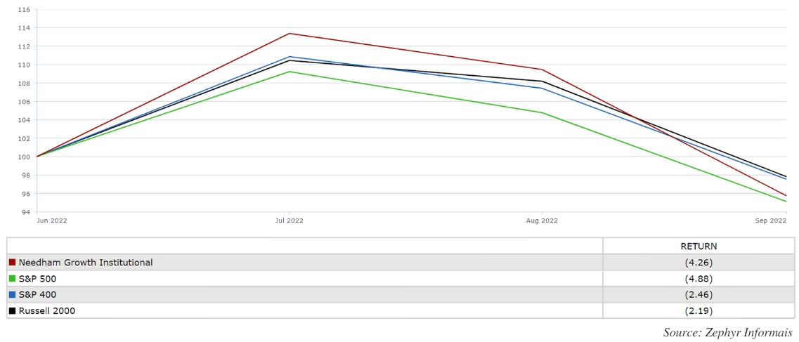 - The Fund’s Institutional (NEEIX) and Retail (NEEGX) classes returned -4.26% and -4.41%, respectively, in 3Q22, outperforming the S&P 500 and S&P 400, but underperforming the Russell 2000.