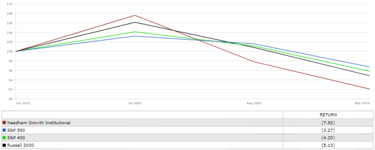 - In 3Q23, the Fund’s Institutional (NEEIX) and Retail (NEEGX) classes returned -7.92% and -7.99%, respectively, underperforming its benchmark indices.