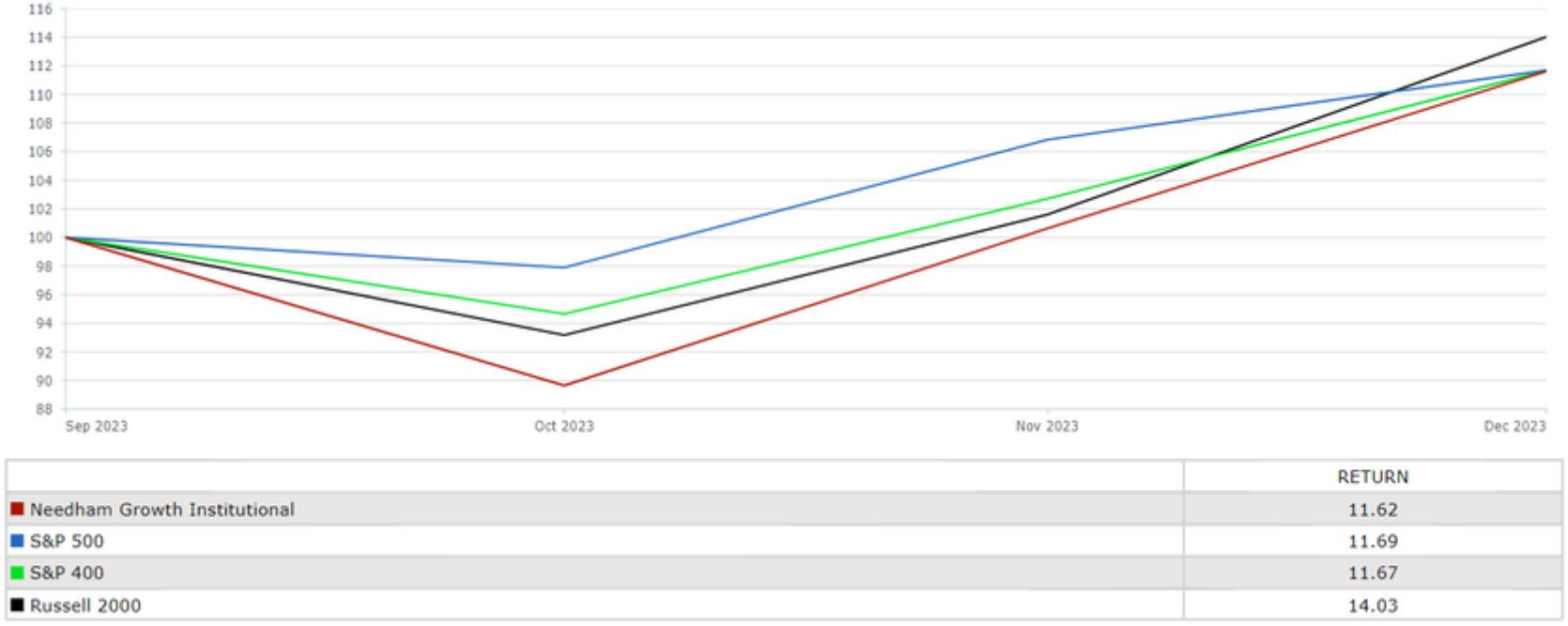 - In 4Q23, the Needham Growth Fund’s Institutional (NEEIX) and Retail (NEEGX) classes returned 11.62% and 11.53%. For the year NEEIX, returned 27.30% and NEEGX returned 26.85% outperforming the S&P MidCap 400’s 16.44%, the Russell 2000’s 16.93%, and the S&P 500’s 26.29%
