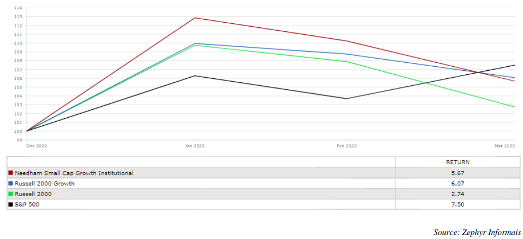 - The Fund’s top five performers in 1Q23 were: Sumo Logic, Inc. (SUMO), Zuora, Inc. (ZUO), Standard BioTools, Inc. (LAB), Yext, Inc. (YEXT), and FormFactor, Inc. (FORM).